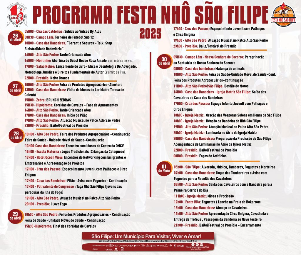19 de Março, 2025 - In Desporto By Magno Tavares Comment off Programação Festa Nhô São Filipe 2025 Magno Tavares Responsável do Departamento da Informação e Tecnologia (IT) da CMSF. Previous Auto De Consignação Da Empreitada Da Reabilitação do Museu Municipal de São Filipe Next Internet Gratuita na Localidade de Cabeça Monte
